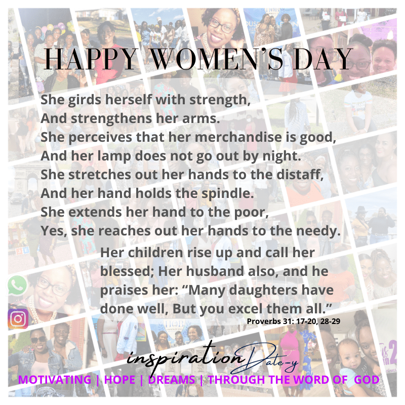 Happy Women’s Day to all my Holy Spirit-empowered, beautiful, strong, “way pavers”, sharp, intelligent, bold, smart, educated, confident, “managers of it all”, God-fearing ladies! I celebrate you today and always for all that you have done, and all you continue to do – changing and shaping your/our world.